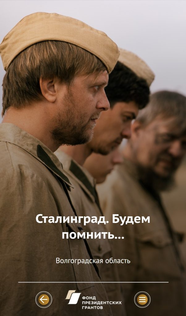 - Кинофильм «Сталинград. Будем помнить…» (2021) о немецких концлагерях на территории Сталинградской области вошёл в ТОП-100 лучших проектов Фонда президентских грантов https://топ.гранты.рф/project?id=414
